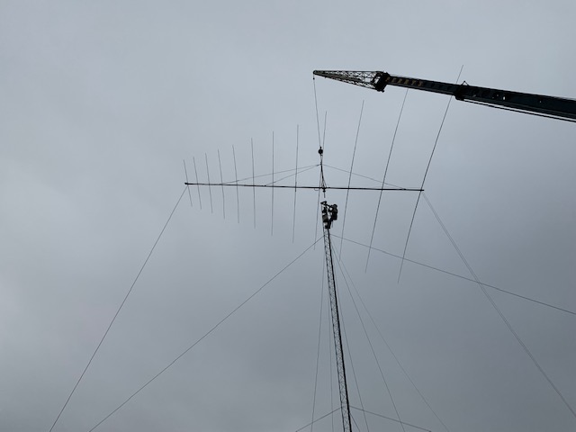 This is a 12 element Log Periodic Array manufactured in 2013 by M2 Communications in Fresno, California, mounted at 70 feet AGL at K5NOF. Nominal gain is 5 dBd at 10 mHz up to 9 dBd at 30 mHz; not exactly a flame-thrower but close to it. Find where the DX is listening and this antenna is a pile-up buster. The M2 LPA 12 uses fiber glass rods to insulate the elements from the boom. These rods pass through an element to boom clamp. Metal elements are slipped onto the fiberglass rod, then the phasing line connections are placed on top and the entire assembly is bolted together through the fiberglass insulating rod. The Texas ice storm of February 2021 placed enough weight on Element 5 (counting from rear to front) to break the fiberglass insulating rod. You can see the elements hanging from the phasing lines. Much has been written about mounting a large antenna on a tower. Fortunately, our long time member and one of our directors, Marsh – WA5UBO is a skilled tower climber with all the necessary equipment to do the job safely. With the help of Don KI5AIU & Greg AB5I to be his ground crew. He coordinated with Perry’s Crane Service, Kerrville, TX, and down the LPA came. Once on the ground, it was decided to replace all the fiberglass insulating rods because of deterioration through the years as well as the RG-213 feed line. M2 could not have been more helpful. This antenna had been out of production for a long time, so the fiberglass rods and the Element 5 hardware were manufactured from scratch and after a couple of months all was available to do the fix. The fix took a while longer because we decided on a couple of “backyard modifications” First to replace the old stainless-steel boom support lines with Phylistran, and secondly, add a third boom support line half way between the mast and the forward boom support line attachment point. We had all ready to go up the tower, long before the weather would let us do it. This antenna is BIG, weighing 75 pounds, with a boom length 45 feel and rear element length of 52 feet tip to tip. Marsh – WA5UBO would look for a weather break, and when he saw a forecast for dry and calm WX, he would schedule the pick with Perry’s Crane of Kerrville, TX. We had three false starts having to cancel due to weather. But no worries, Mr. Perry was great to work with and finally came the day, 6 May 2022. Marsh and helpers, Don, KI5AIU and John, KK4ZRP arrived early to have all ready to go when the crane arrived. It took 30 minutes for Mr. Perry to set up and deploy the Jib boom with Don’s help. Down came the hook to be connected to the boom straps fore and aft of the mast and to the mast itself, and up she went. You can see the preliminary lift below left with Marsh up the tower in the background. The idea here is to insure all is in balance; you can see it is. So without further ado, the antenna, with new thrust bearing installed on the mast, was positioned directly over the tower thrust bearing plate where Marsh could guide it into the rotor connection, while the crane operator gently lowered it into the rotor seat. Then Marsh connected the thrust bearing, then connected the rotor, unhooked the crane cable and then removed the lifting straps from the beam. The final work here was to attach the coax for 360 degree rotation around the tower and waterproof same. But not done yet. |
